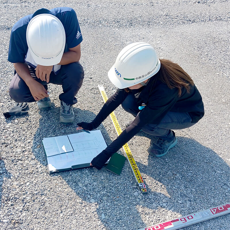 今は造成工事をしています。生コンの注文や材料の準備、丁張を作ったりなど、工事がスムーズに出来るように段取りをします。一緒に作業をしている業者さんと工事内容や今日・明日の作業予定についての話などもしています。